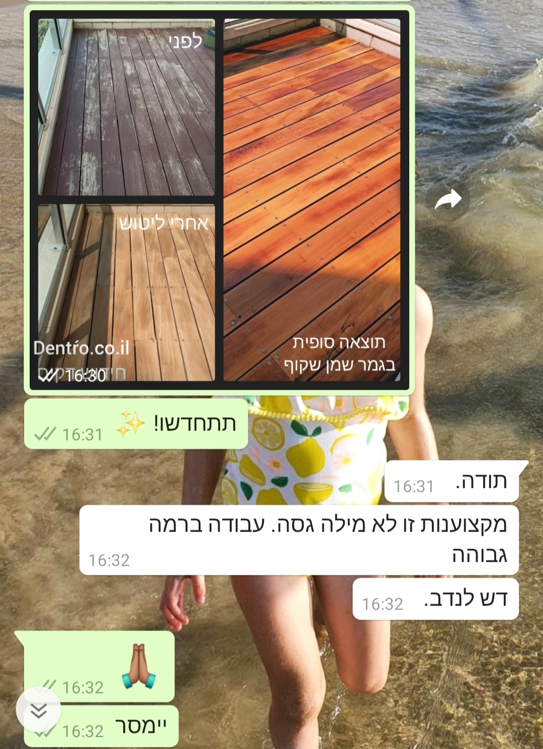 לנו בדנטרו הניסיון וההבנה כי יש לתחזק דקים ע"י שיוף עדין ושימון שנתי בחומרים האיכותיים ביותר כדי לשמור על העץ מפגעי מזג האויר ופגיעות אחרות וכמובן כדי לשמור על המראה היפה של העץ.